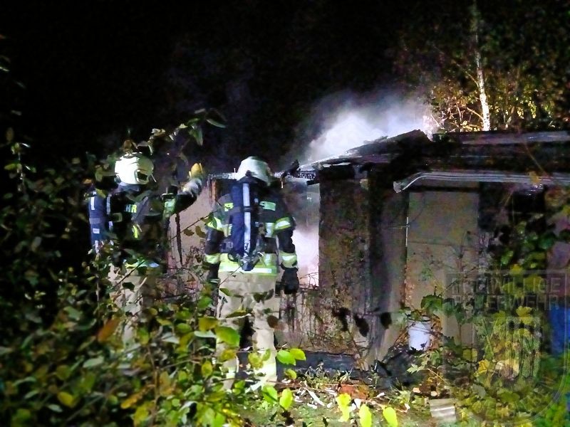 Bereits auf der Anfahrt waren zwischen den Wohnhäusern deutlich lodernde Flammen in den dahinterliegenden Gärten zu sehen. Vor Ort stellte sich heraus, dass ein Gartenschuppen in Vollbrand stand. Etwa 30 Meter entfernt brannte zudem ein weiterer kleinerer Schuppen.