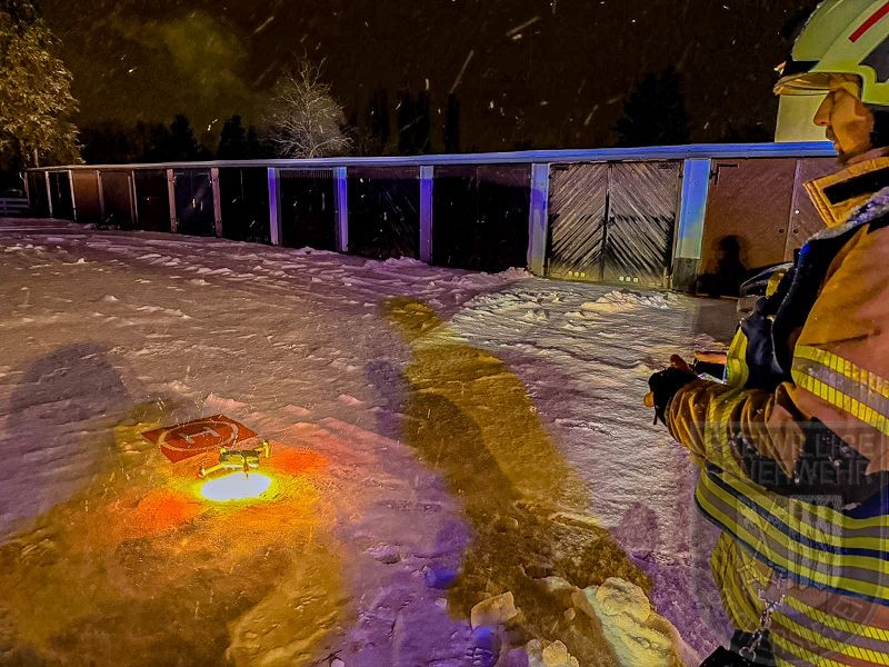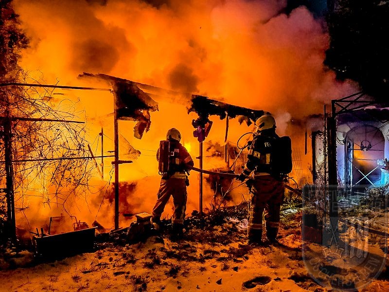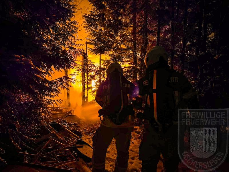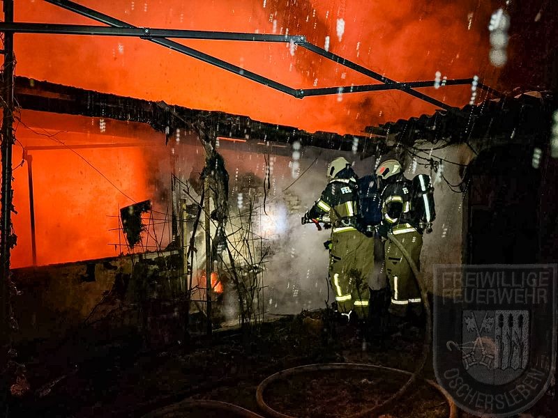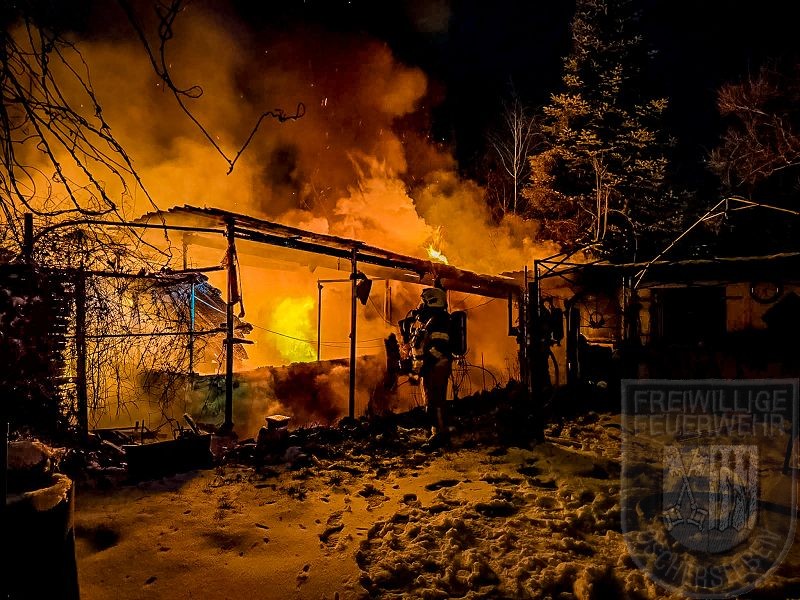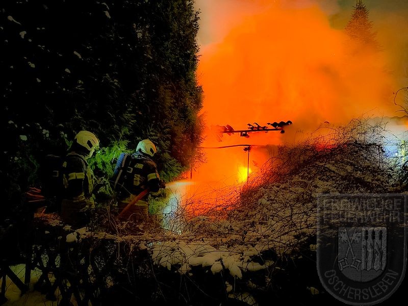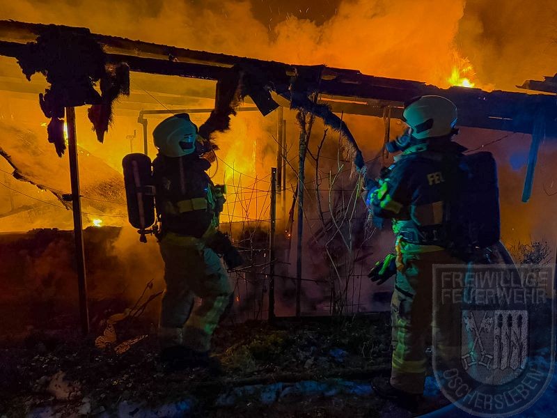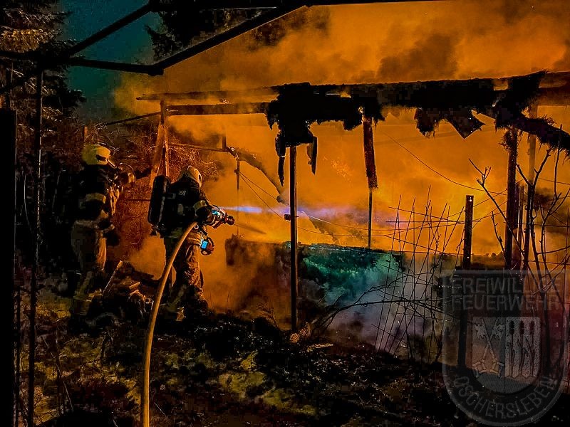 Beim Eintreffen der Feuerwehr stand eine Gartenlaube bereits in Vollbrand, das Feuer hatte zudem auf eine zweite Laube übergegriffen. Unverzüglich gingen zwei Trupps unter Atemschutz zur Brandbekämpfung vor. Zunächst mussten jedoch rund 150 Meter Schlauch verlegt werden, um die Wasserversorgung an der Einsatzstelle sicherzustellen. Ein vollständiges Abbrennen der zweiten Gartenlaube konnte verhindert werden. Mehrere Gasflaschen wurden rechtzeitig aus dem Gefahrenbereich ins Freie gebracht.