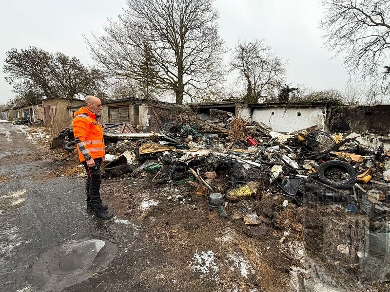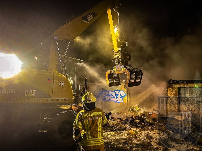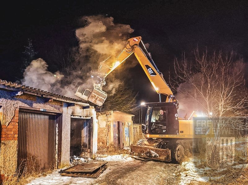 Da die Garagen mit Müll und Unrat gefüllt waren, kam ein Bagger zum Einsatz, um die gesamte Brandlast aus den Garagen zu entfernen. Ein besonderer Dank gilt hierfür Robert Braumann. Auch nach der Beräumung waren noch umfangreiche Nachlöscharbeiten erforderlich.